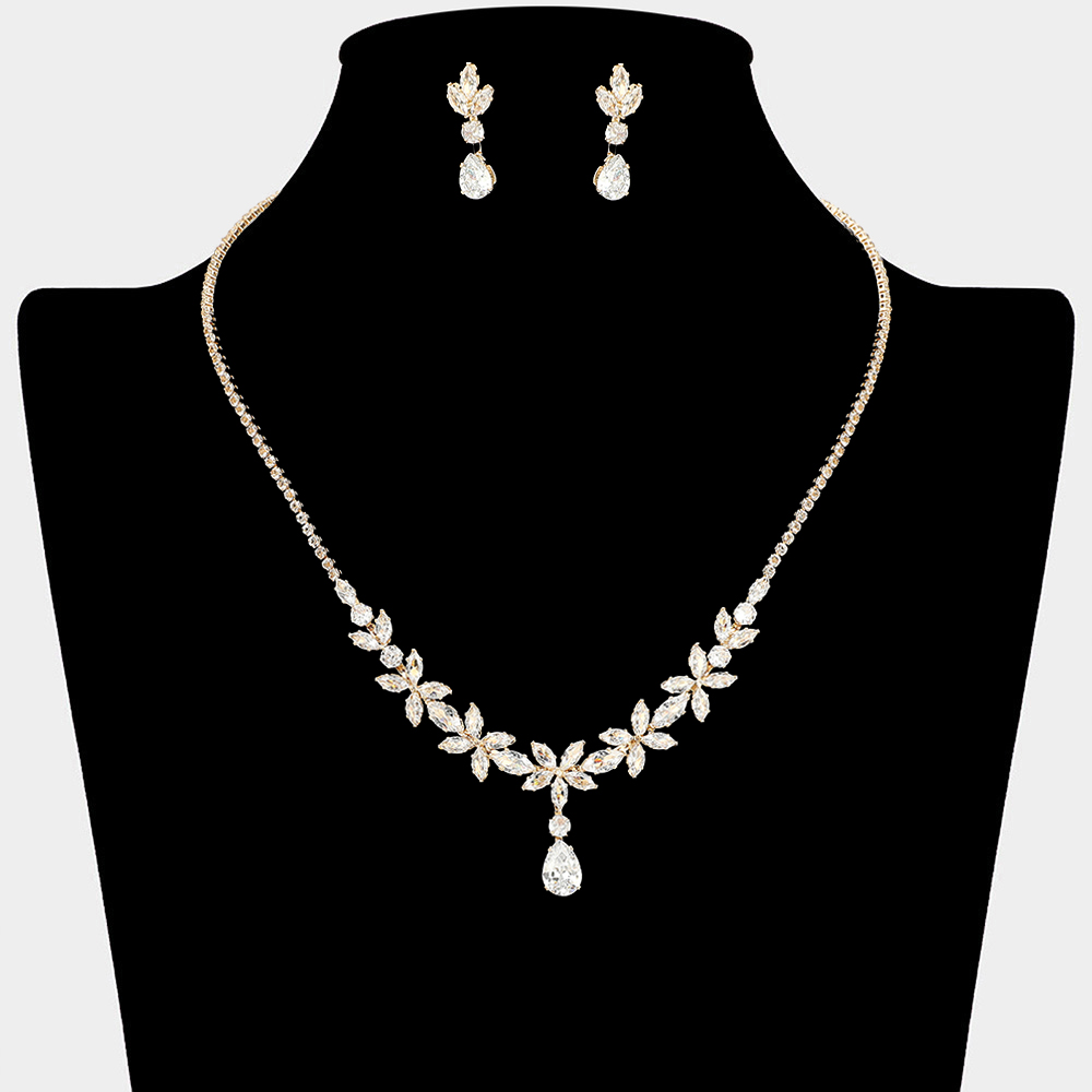 • Refined necklace and earring set featuring a graceful drop centerpiece and coordinated accents. Designed to elevate bridal looks, formal outfits, and special occasion styling. A timeless statement set that adds polished elegance to weddings, parties, and evening wear.