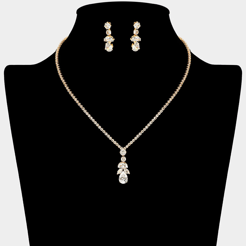 • Enhance your look with this elegant teardrop necklace and earring set. Designed to captivate with its refined sparkle and timeless charm, this jewelry set adds sophistication and grace to any occasion, making it a perfect choice for both formal and special events.