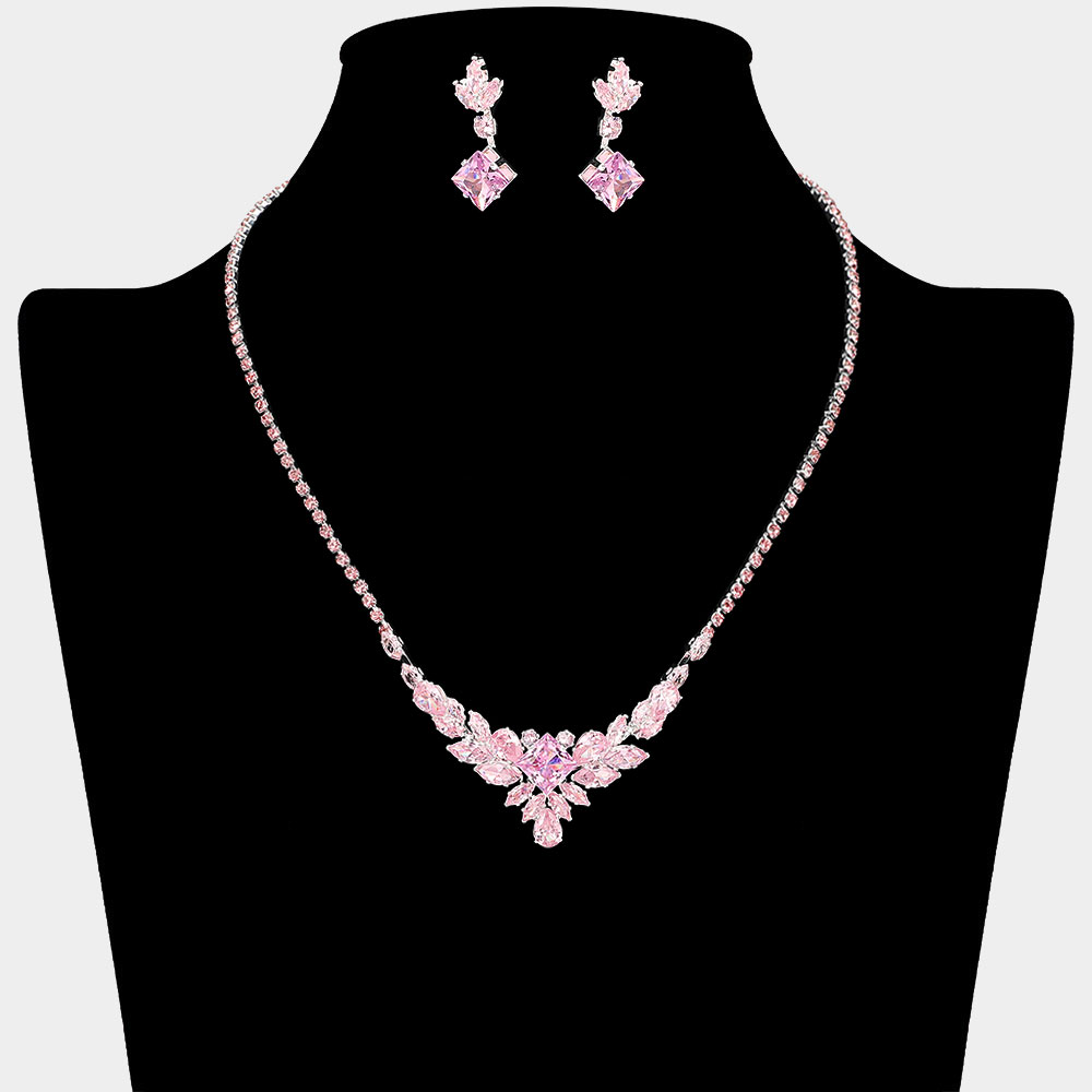 Details • Necklace Size : 16.75" + 4.75" L • Decor Size : 0.75" L • Earrings Size : 1" L • Stunning jewelry set featuring a V-cut necklace with dazzling cubic zirconia stones and matching drop earrings. Designed for elegance, this set adds brilliance and refinement to formal outfits and evening wear. • CZ Cubic Zirconia