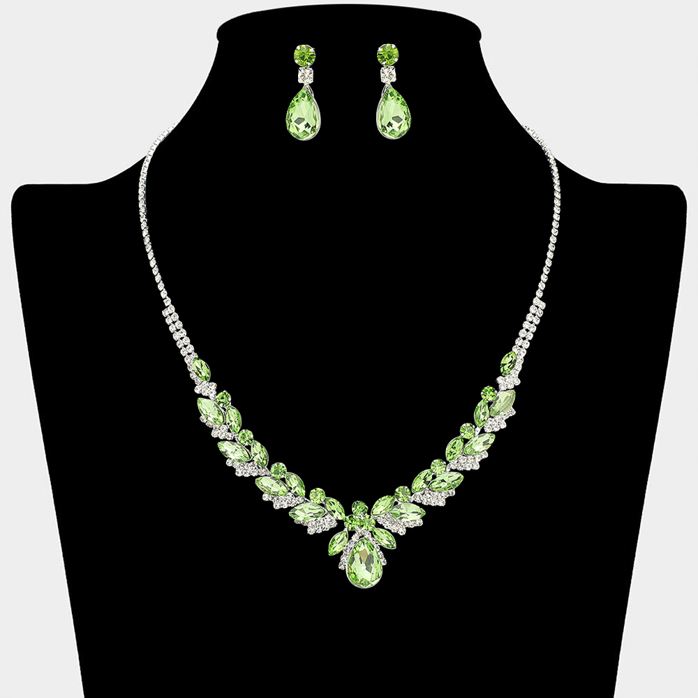 • This elegant statement necklace and matching earring set features layered teardrop accents that create a dramatic yet refined silhouette. Designed to highlight the neckline with graceful sparkle, it is ideal for formal occasions, bridal styling, evening events, and upscale boutique collections.