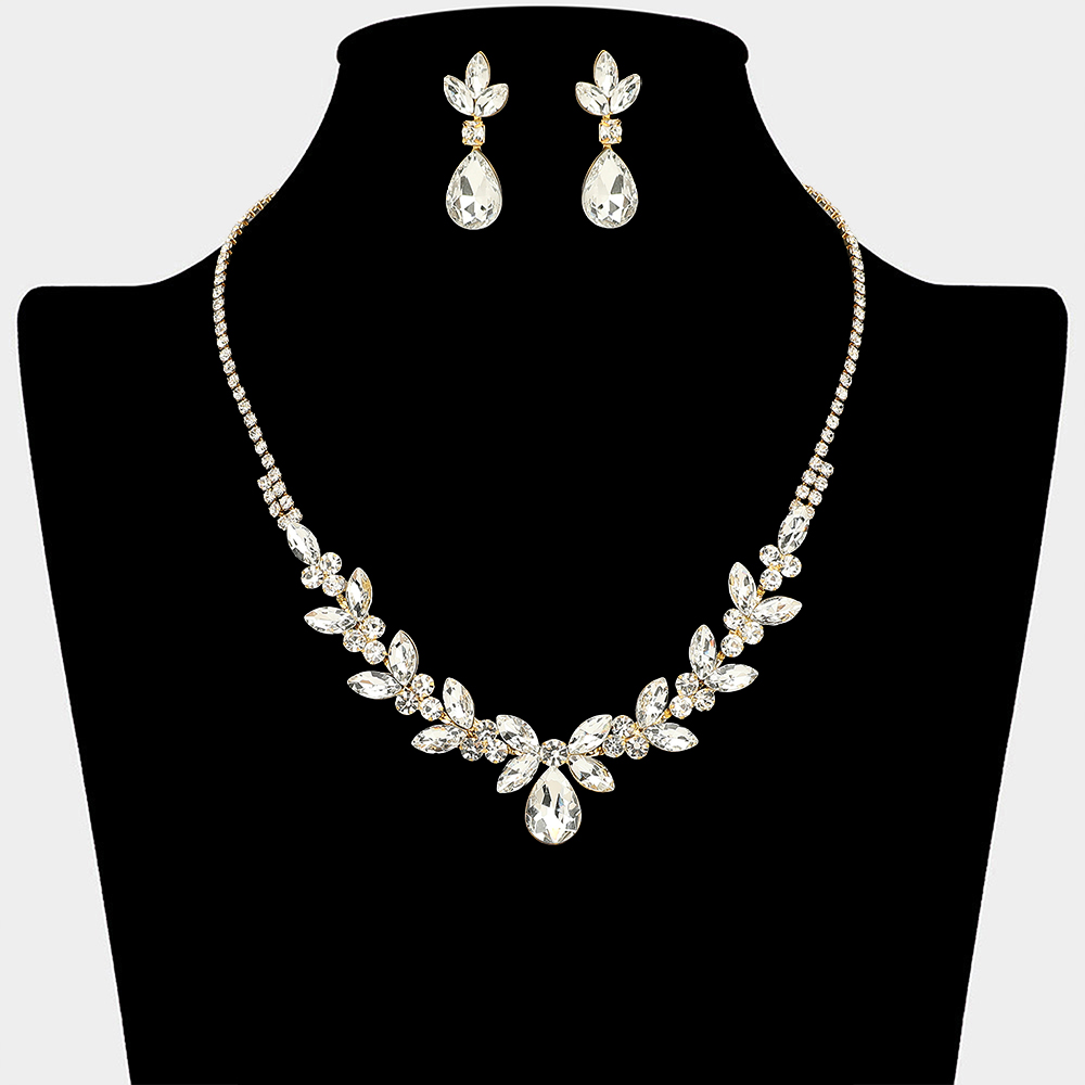 Details • Necklace Size : 16" + 4.5" L • Decor Size : 1" L • Earrings Size : 1.25" L • This elegant necklace and matching earring set features a leaf-inspired design with a graceful drop centerpiece that frames the neckline beautifully. Perfect for weddings, formal events, proms, and evening occasions, it adds refined sparkle and a timeless statement to special occasion looks.