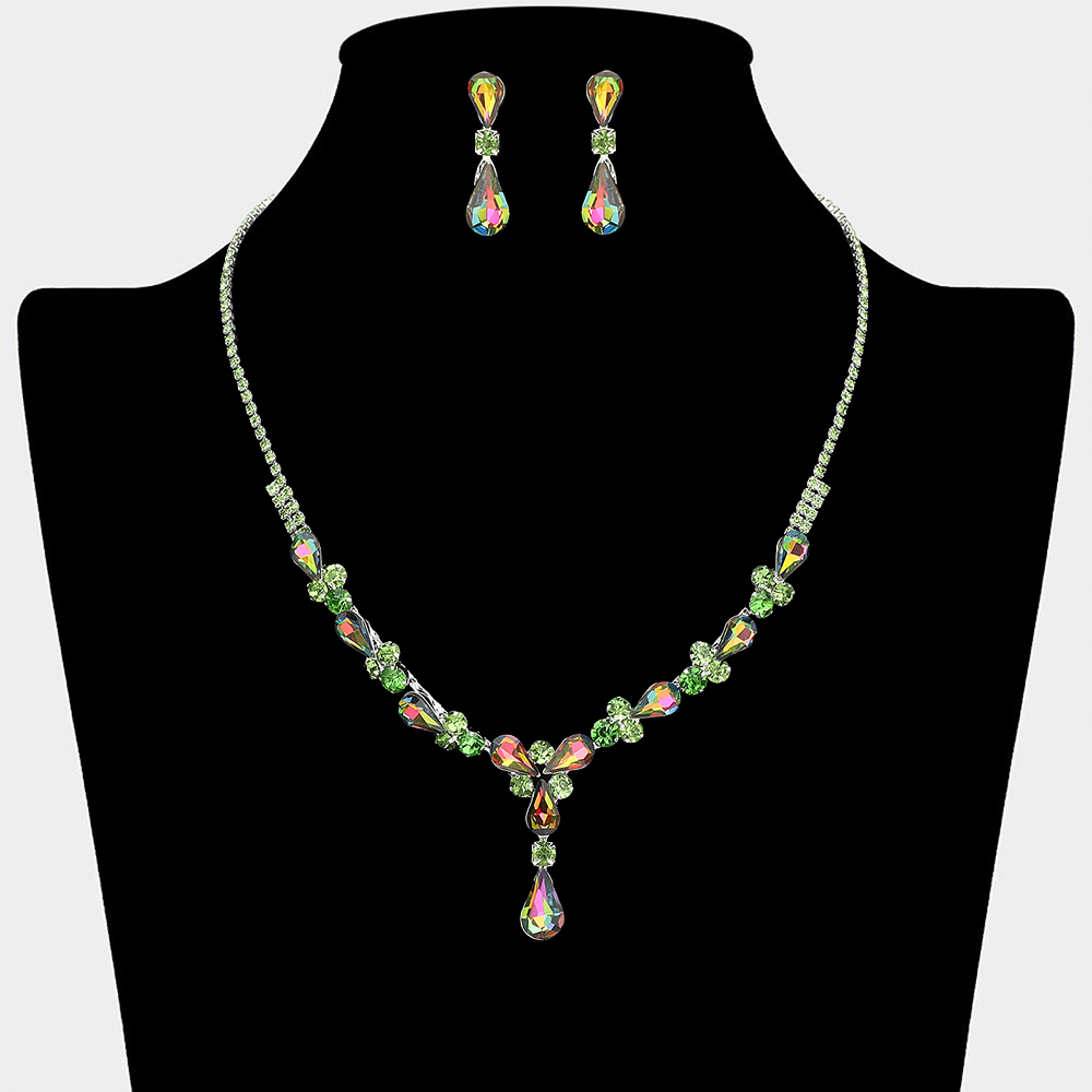• This elegant necklace and earring set features a graceful teardrop crystal design that highlights the neckline with refined sparkle. Ideal for weddings, bridal looks, formal occasions, and evening wear, it delivers a timeless statement that complements gowns, dresses, and special event styling with effortless sophistication.
