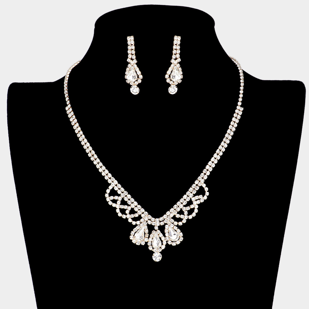 • Complete your look with this elegant rhinestone teardrop necklace and earrings set. Featuring cascading teardrop pendants with sparkling accents, this timeless jewelry is ideal for weddings, proms, galas, or evening events, adding refined charm and brilliance to your special occasion style.