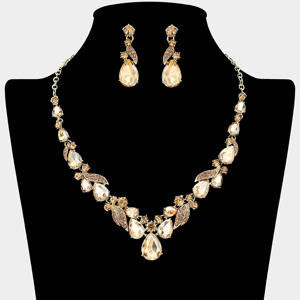 Details • Necklace Size : 18" + 3" L • Decor Size : 1.25" L • Earrings Size : 1.6" L • Elevate formal and evening looks with this statement necklace and earring set featuring layered teardrop and marquise accents arranged in a graceful, eye-catching design. Ideal for weddings, proms, parties, and special occasions, this coordinated set adds dramatic sparkle and refined glamour to any outfit.