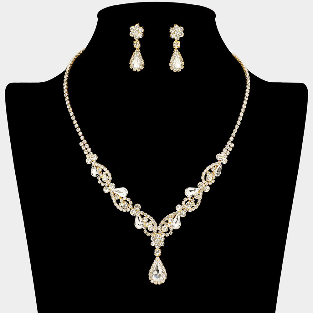 • Dazzle with this iridescent teardrop necklace and earring set, featuring a radiant display of shimmering stones and intricate detailing. Perfect for special occasions or evening wear, this elegant jewelry set adds a touch of glamour and brilliance to any sophisticated ensemble.