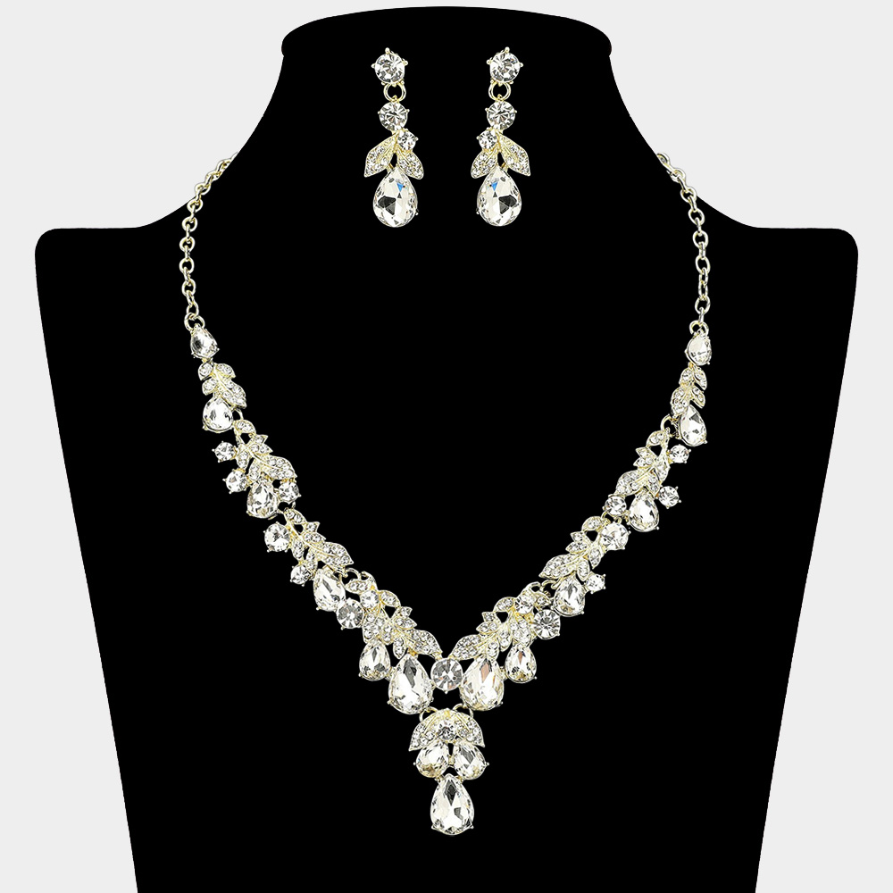 Details • Necklace Size : 19" + 3" L • Decor Size : 1.6" L • Earrings Size : 1.6" L • Dazzle with sophistication in this crystal drop necklace and earring set, designed for weddings, formal events, or glamorous evenings. The intricate detailing and sparkling stones create a timeless, luxurious look that enhances any outfit with elegance and radiant charm.