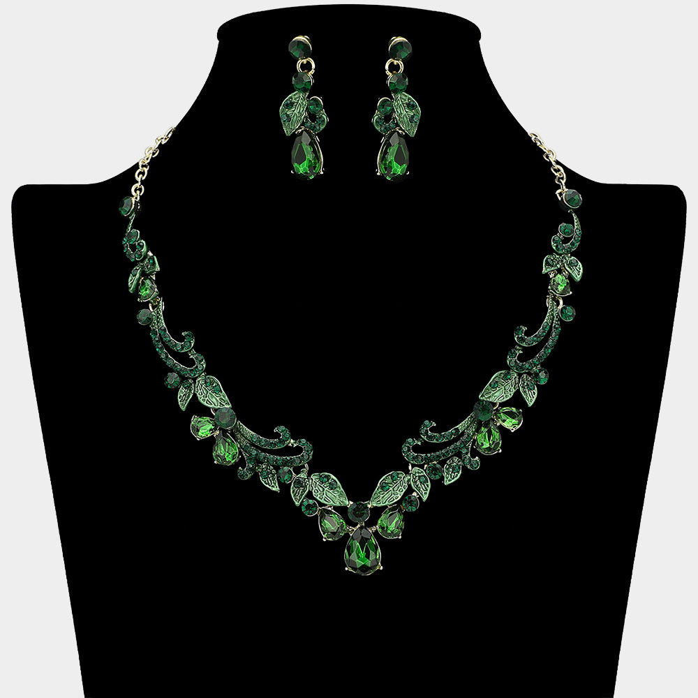 • Dazzling necklace and earring set featuring teardrop crystals with intricate leaf accents. Perfect for weddings, pageants, or evening events, this set adds a refined and elegant touch to any special occasion look.