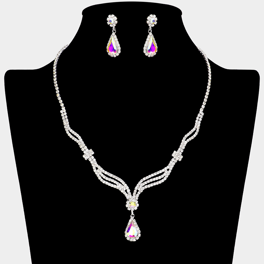 Crystal Rhinestone Bubbly Teardrop Necklace Clip on Earring Set