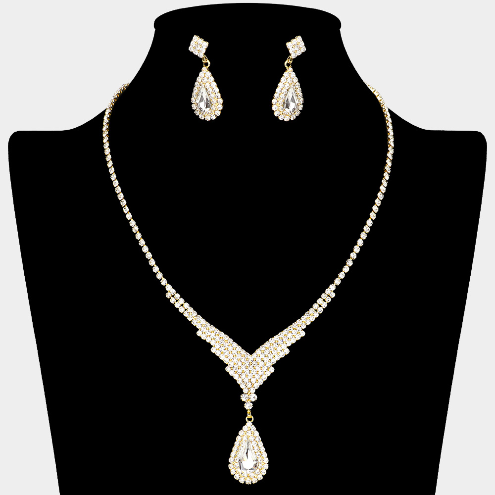 Details • Necklace Size : 16.5" + 4.5" L • Decor Size : 1.8" L • Earrings Size : 1.3" L • Shine with this rhinestone teardrop necklace and earrings set, perfect for weddings, formal parties, and prom nights. Featuring a sparkling teardrop pendant and matching earrings, this jewelry set offers timeless elegance and sophistication for brides, bridesmaids, or evening wear. • Lead and Nickel Compliant