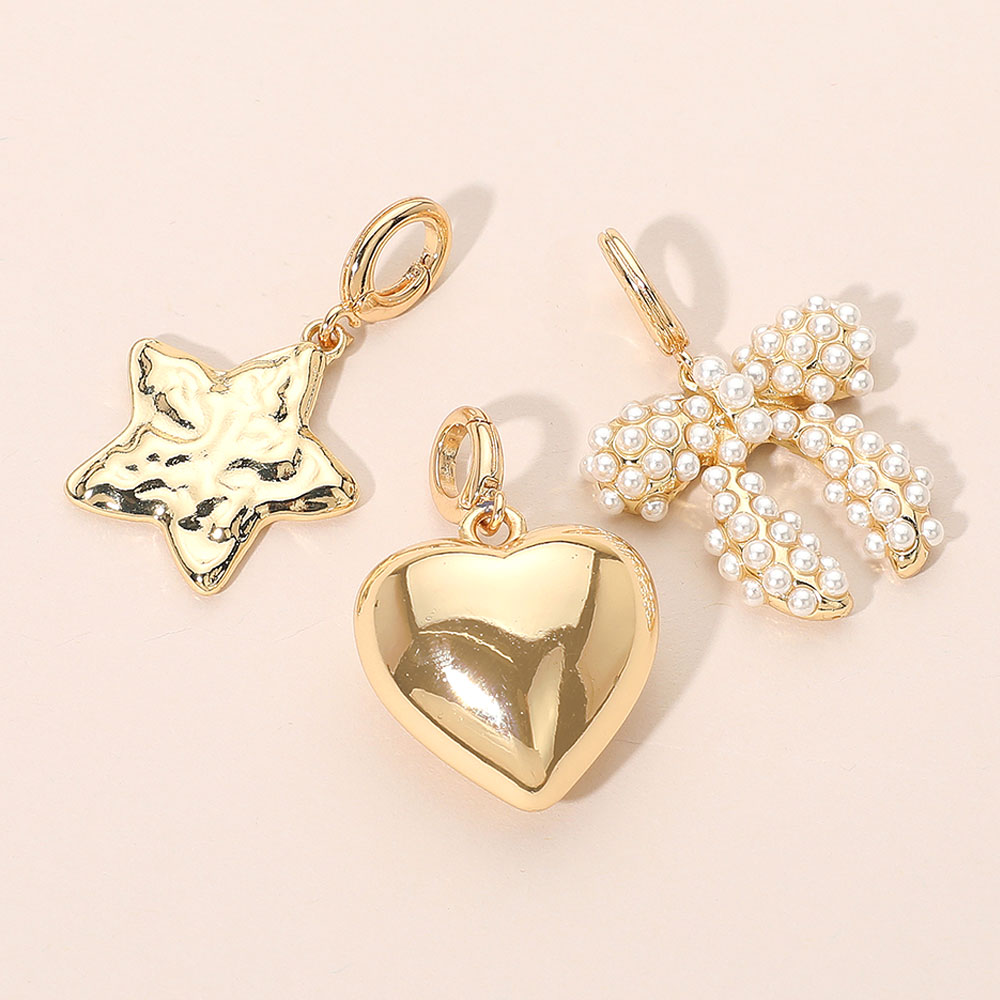 Details • Size : 1.7" L • Enhance your favorite bracelets or necklaces with this timeless pendant charm set featuring a chic bow, modern star, and classic heart design. Perfect for customizing everyday looks or gifting, each charm adds a touch of personality and style to your accessories. Ideal for collectors and jewelry lovers. • Lead and Nickel Compliant