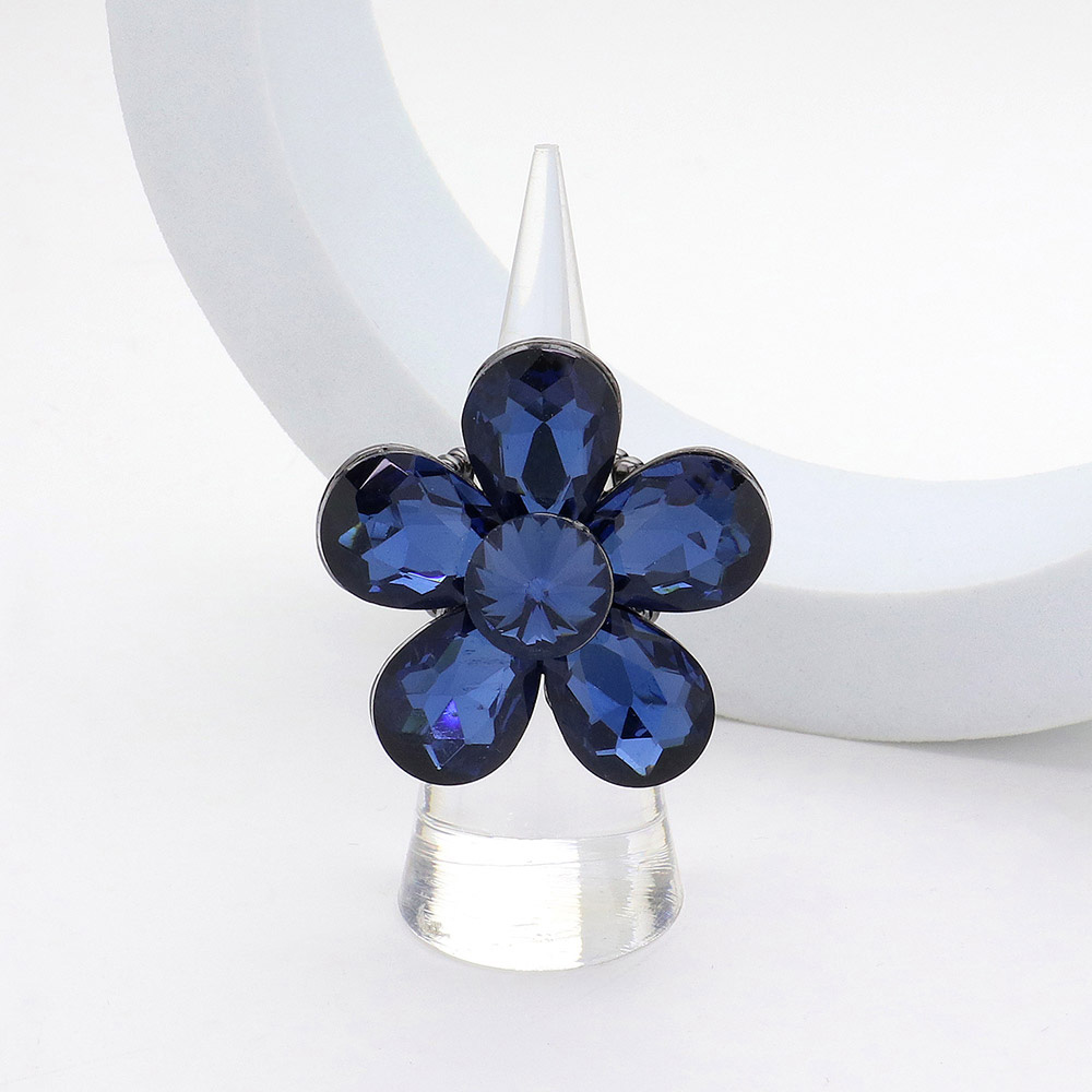 Details • Size : 1.5" H • Stretchable • Elegant flower-shaped statement ring featuring a dazzling faceted petal design that catches the light beautifully. Perfect for adding a bold, eye-catching accent to any outfit, this gem-inspired accessory enhances your style with its unique shape and sparkling radiance. • Lead and Nickel Compliant