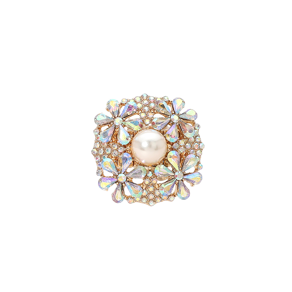 Pearl Centered Rhinestone Embellished Blossom Stretch Statement Ring