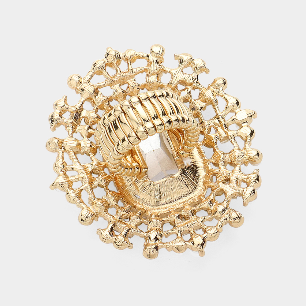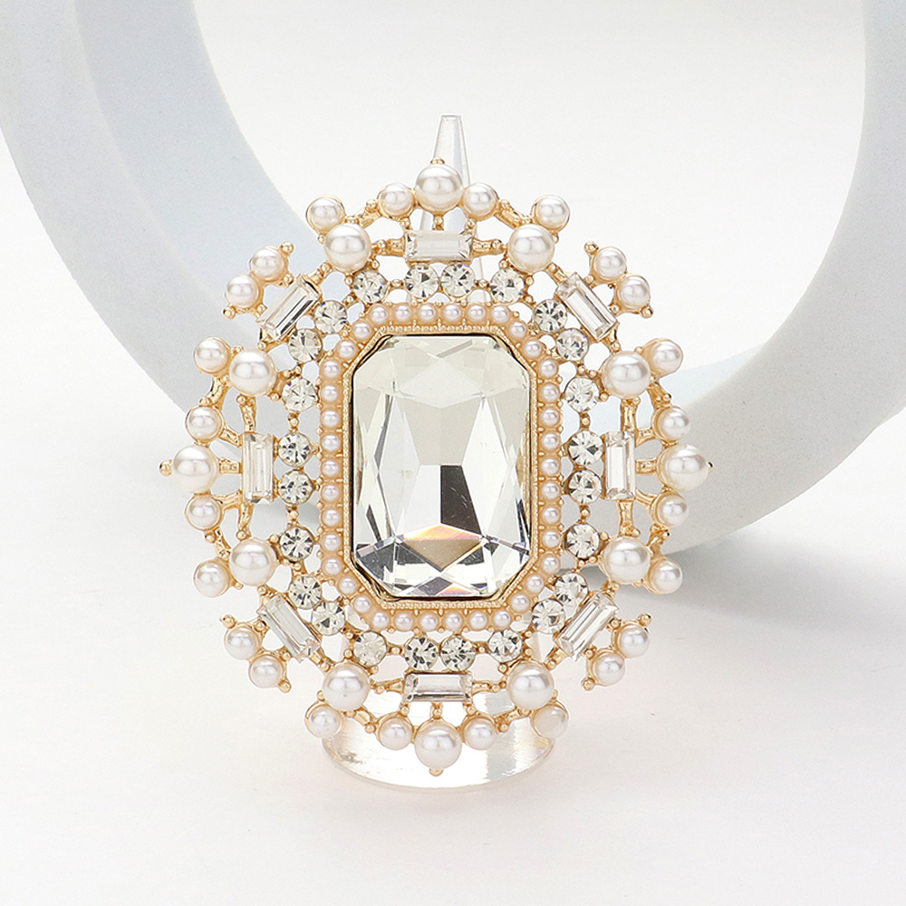 Rectangle Glass Stone Centered Pearl Rhinestone Embellished Stretch Ring