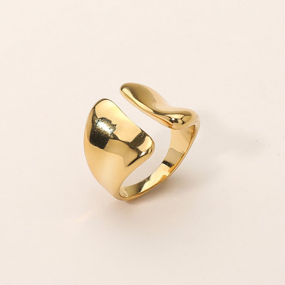 Details • Size : 0.7" H • Size 7 Only • Contemporary stainless steel open band ring showcasing a smooth, fluid organic shape with a bold sculptural finish. Designed for everyday elegance, this minimalist statement ring complements any outfit with its artistic and modern appeal, perfect for layering or solo wear. • Hypoallergenic • Stainless Steel