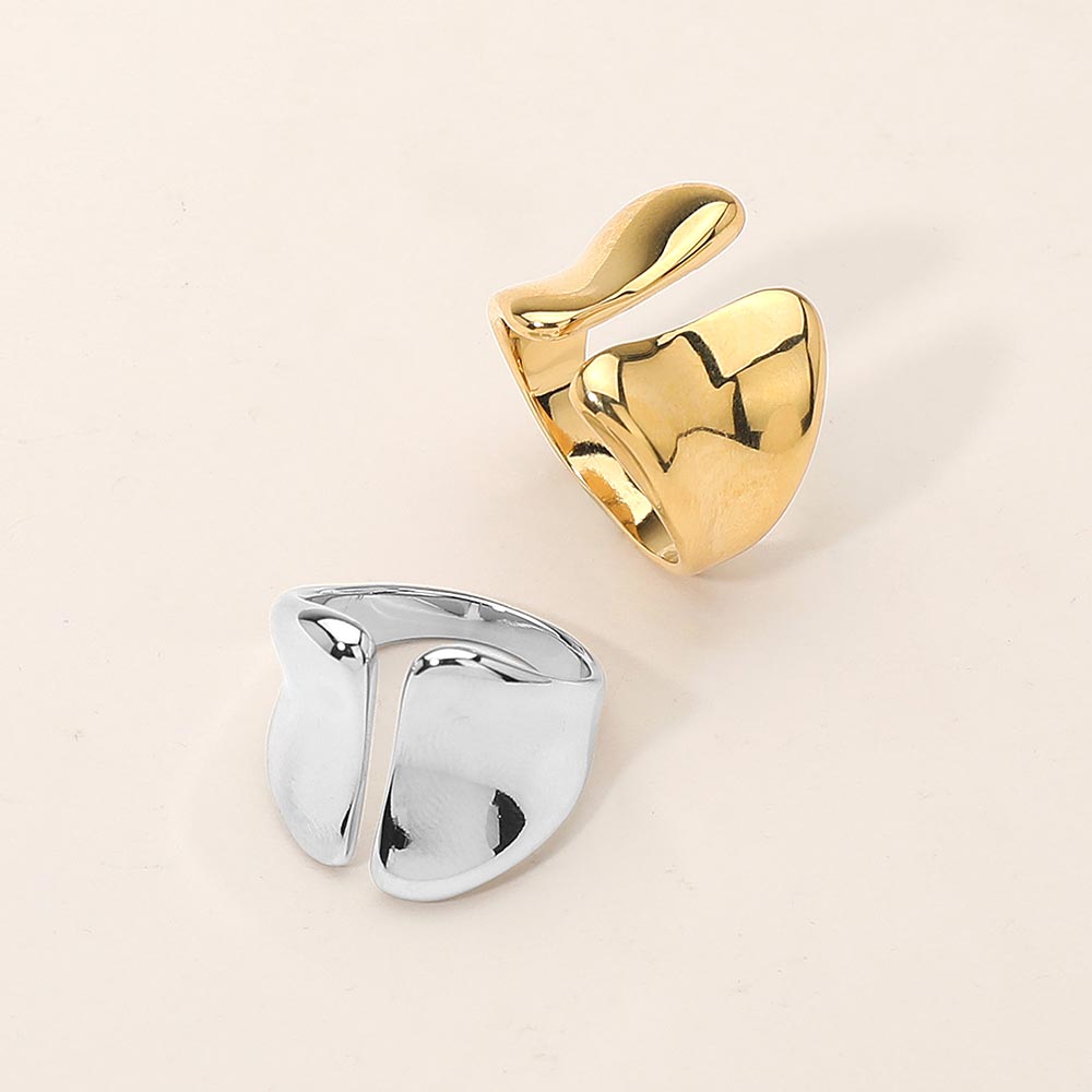 Details • Size : 0.7" H • Size 7 Only • Contemporary stainless steel open band ring showcasing a smooth, fluid organic shape with a bold sculptural finish. Designed for everyday elegance, this minimalist statement ring complements any outfit with its artistic and modern appeal, perfect for layering or solo wear. • Hypoallergenic • Stainless Steel