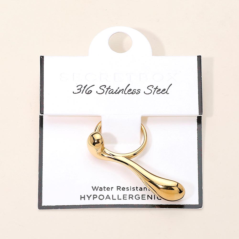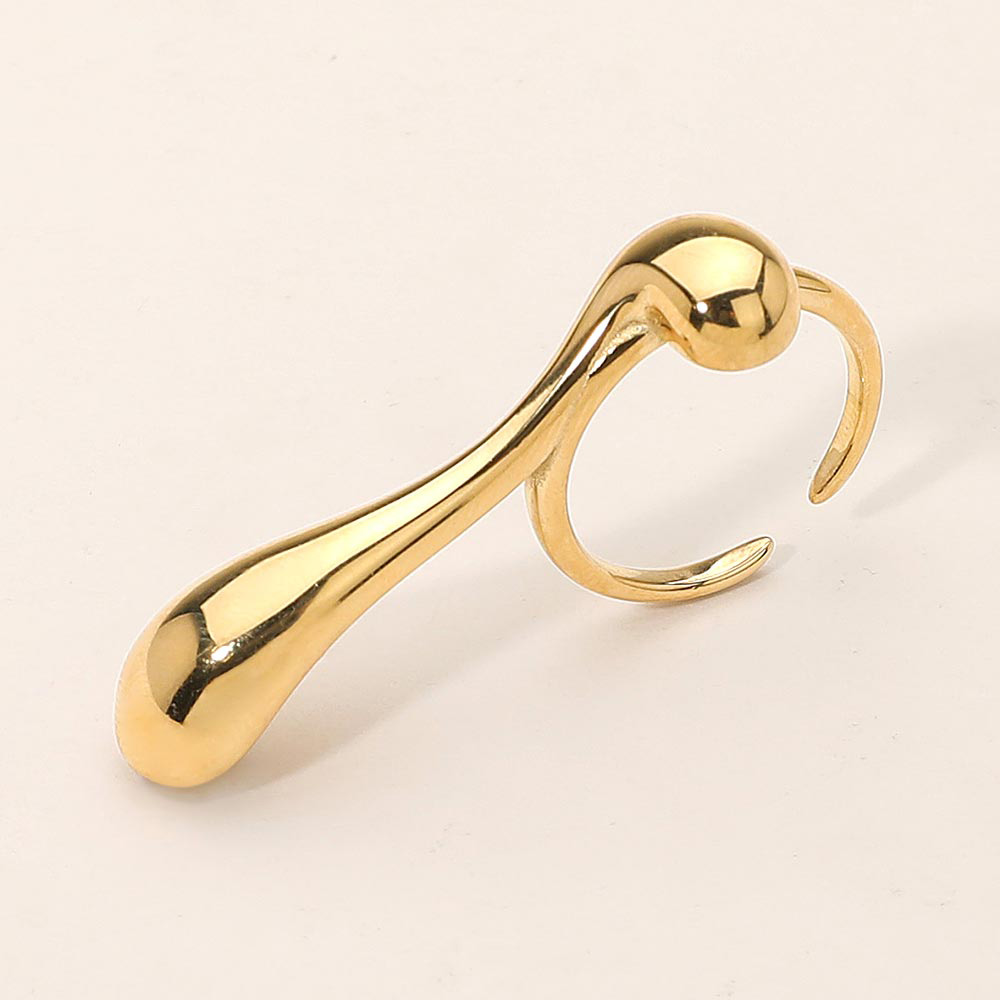 • Contemporary stainless steel ring featuring a sleek sculptural drop design that wraps elegantly around the finger. Its minimalist yet bold shape makes it a standout accessory, perfect for adding a touch of modern artistry to casual or sophisticated looks.