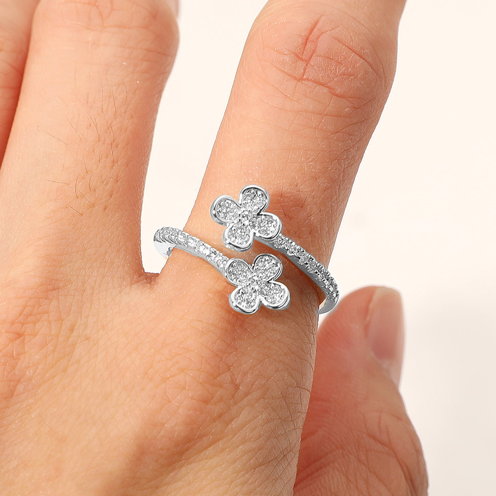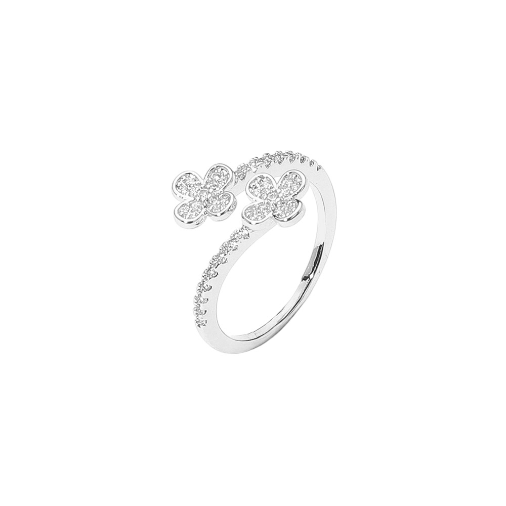 Details • Size : 0.5" H • Adjustable • Elegant adjustable ring featuring two sparkling quatrefoil designs for a feminine and stylish touch. Perfect for adding delicate charm to everyday wear or special occasions, this open-band ring offers comfort, shine, and timeless floral elegance. • Brass • Lead and Nickel Compliant