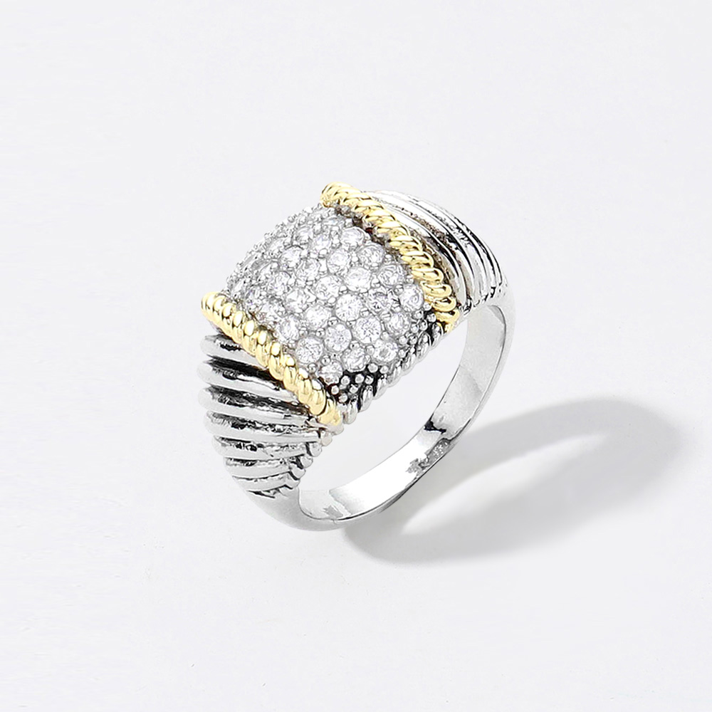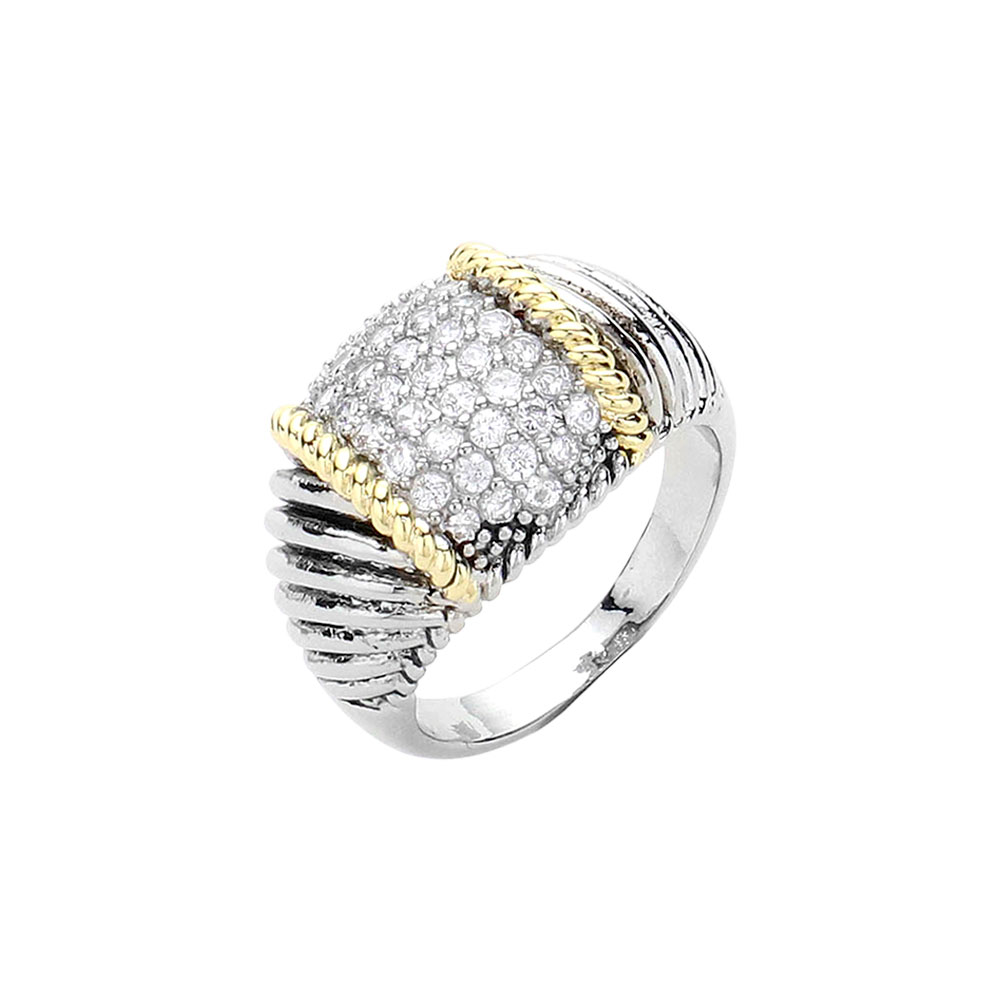• Bold cushion-style ring with pavĂ© CZ center and twisted rope detailing. Perfect for adding a refined touch to your jewelry collection.