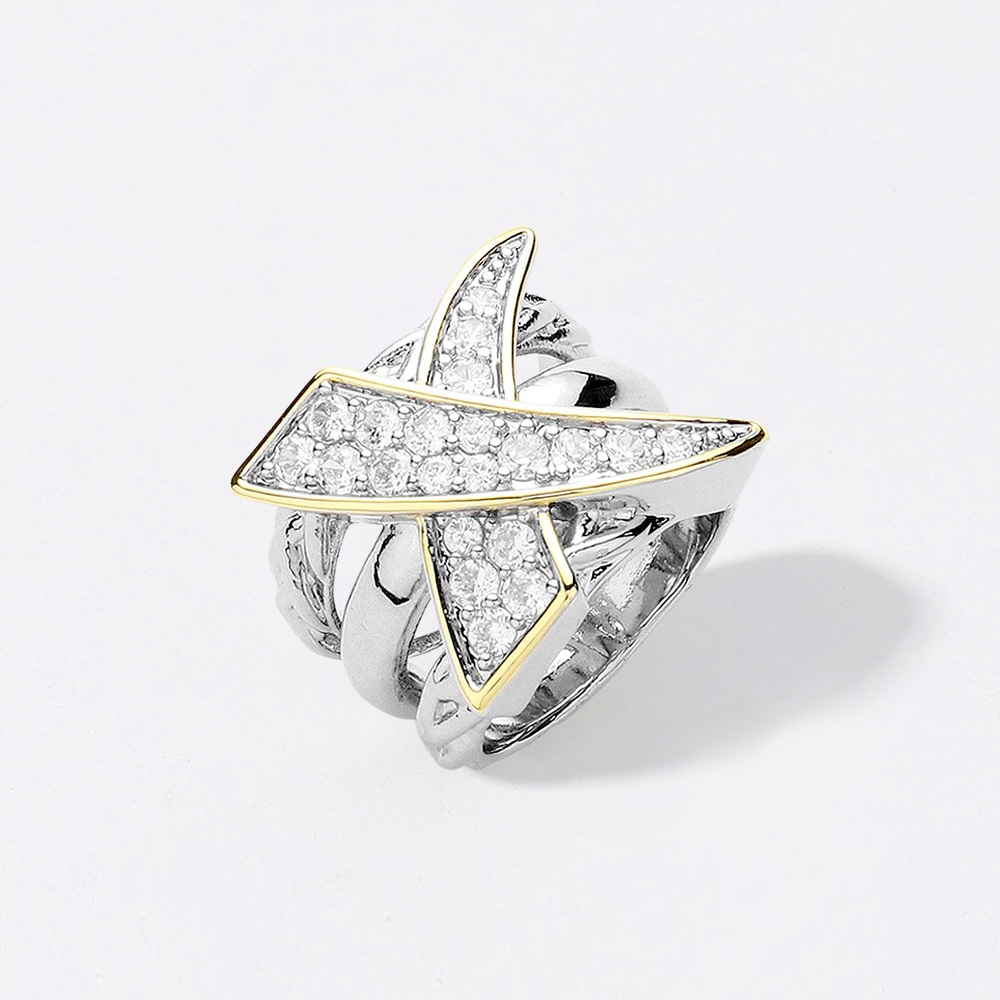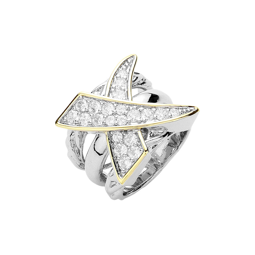 Details • Size : 0.75" H • Eye-catching statement ring featuring a crisscross design with sparkling pave detailing and polished finish. A bold accessory that adds modern flair and shine to any look. Ideal for special occasions or elevating everyday style with a touch of drama. • CZ Cubic Zirconia