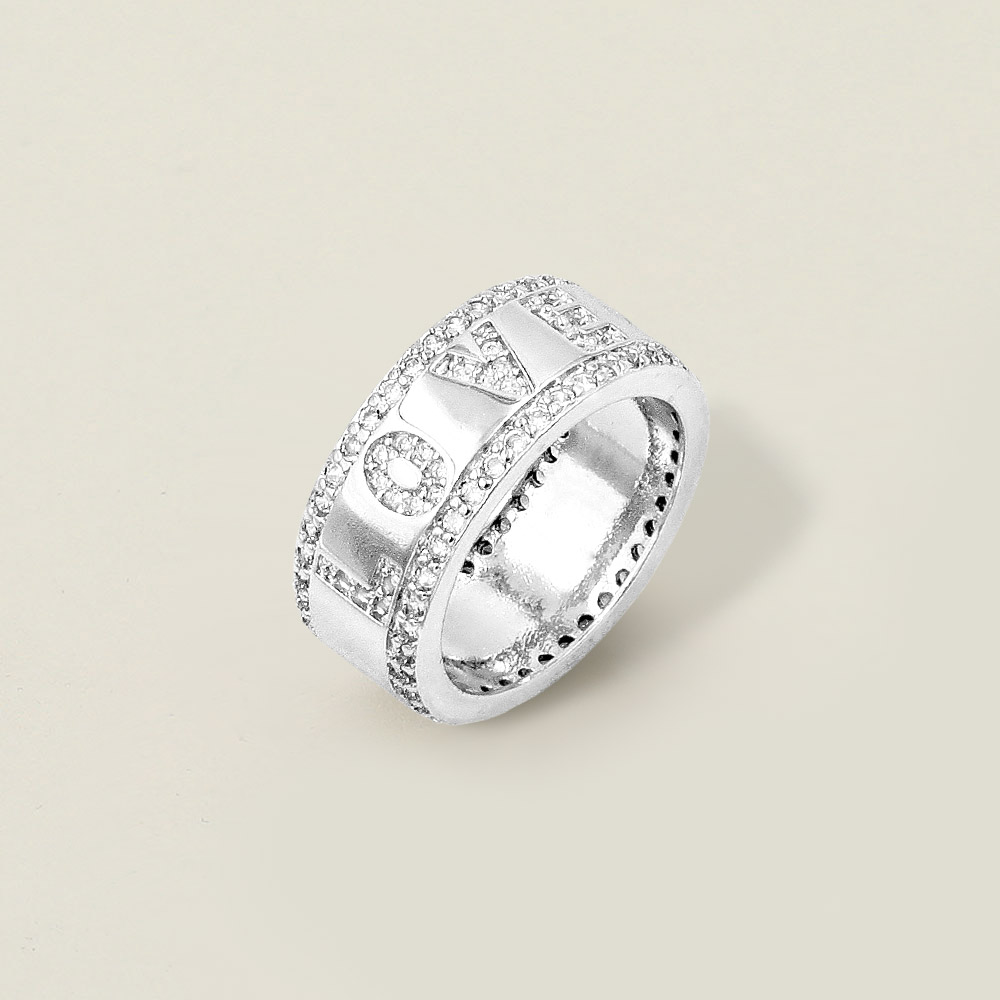 • Bold LOVE letter band ring featuring a wide silhouette with shimmering cz paved accents for a radiant, expressive look. A standout accessory that adds meaning and shine to any style, perfect for gifting or elevating everyday wear with a touch of sentiment.