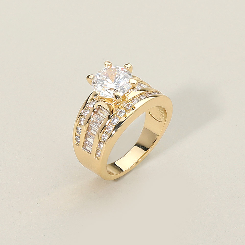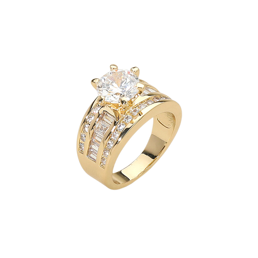 • Elegant statement ring showcasing a brilliant round cut cubic zirconia centerpiece framed by double bands adorned with baguette and pave accents. Designed for modern sophistication, this radiant piece captures timeless glamour for both special occasions and refined daily wear.