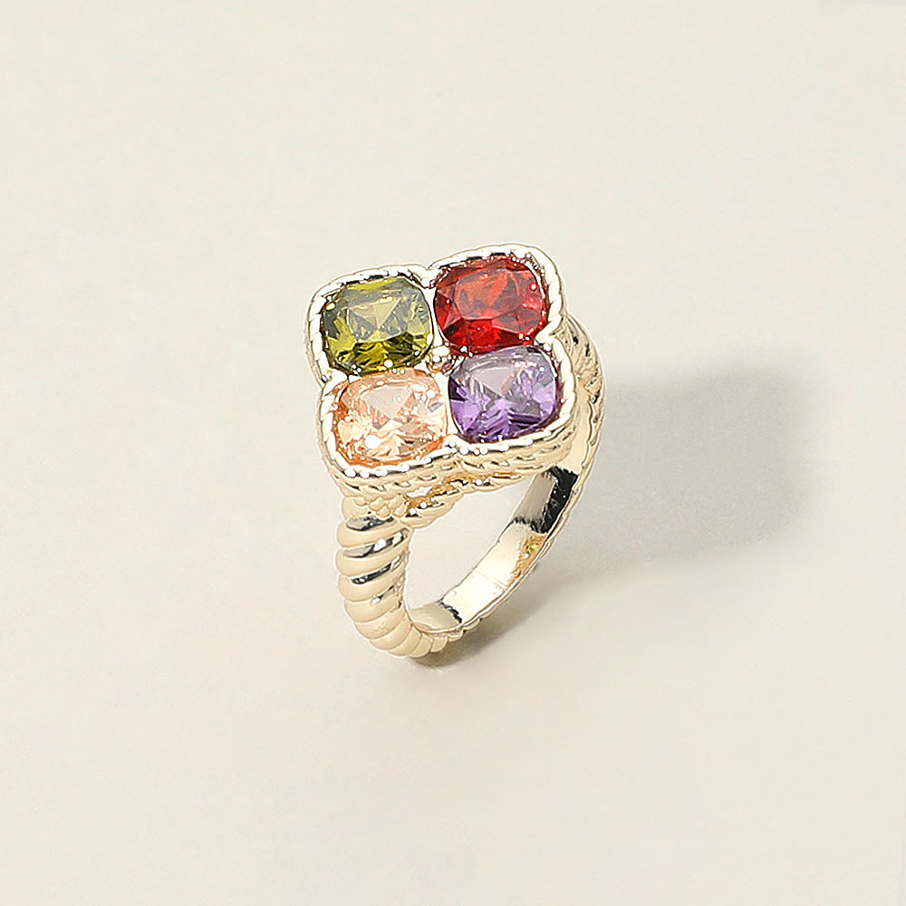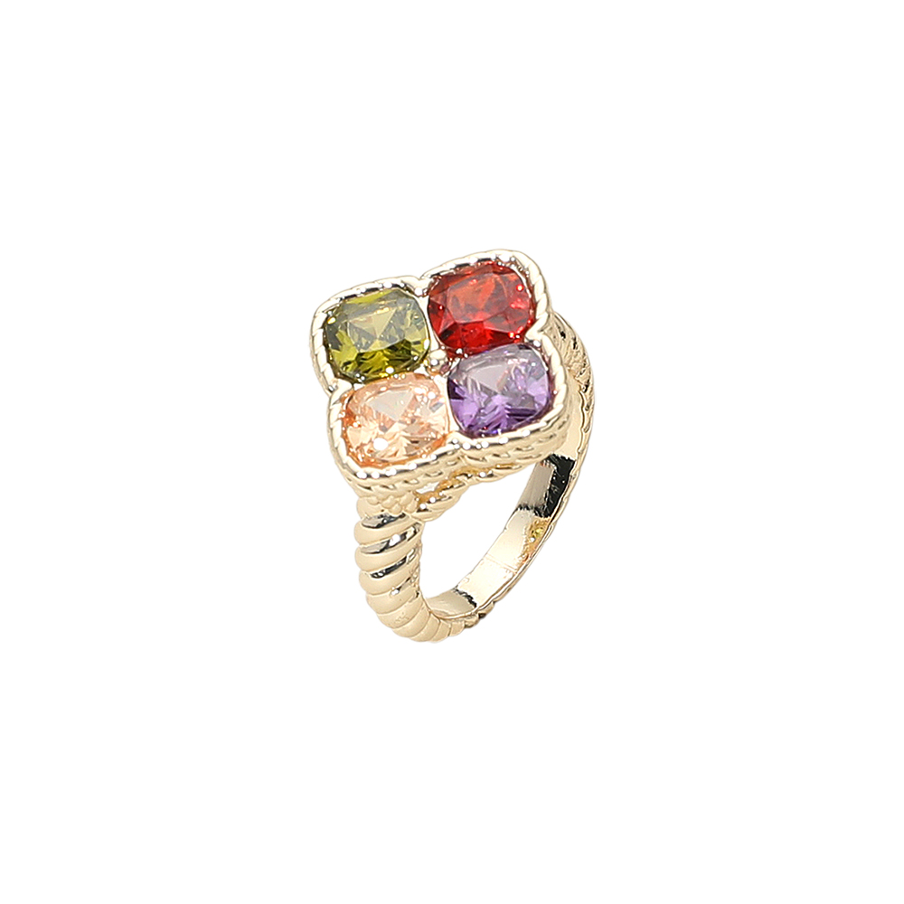 Details • Size : 0.75" H • Elegant ring showcasing a square cluster design with four faceted cz gemstones set in a raised border. The textured band adds a refined touch, making this geometric ring a standout accessory that balances color, form, and sophistication for any outfit or occasion. • CZ Cubic Zirconia