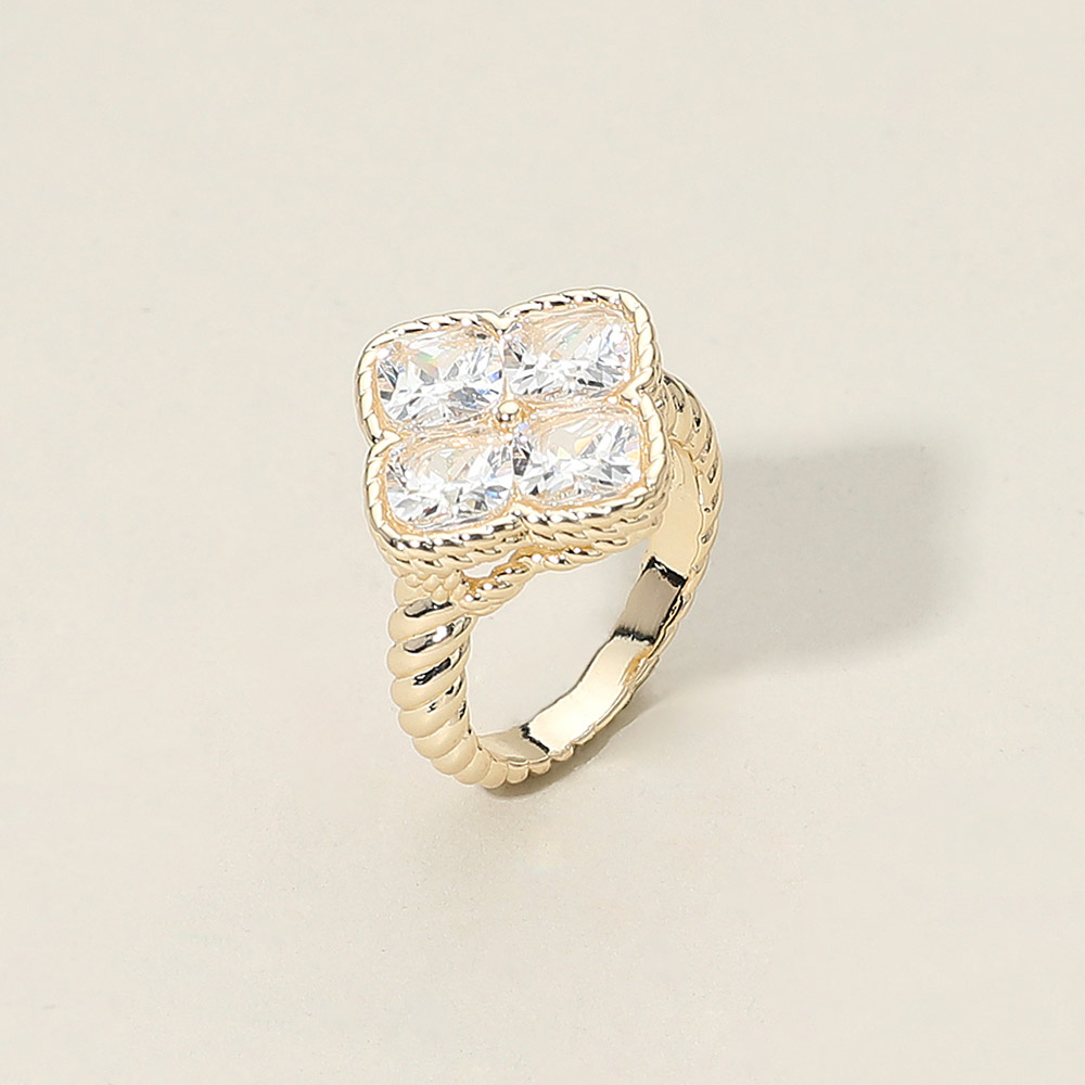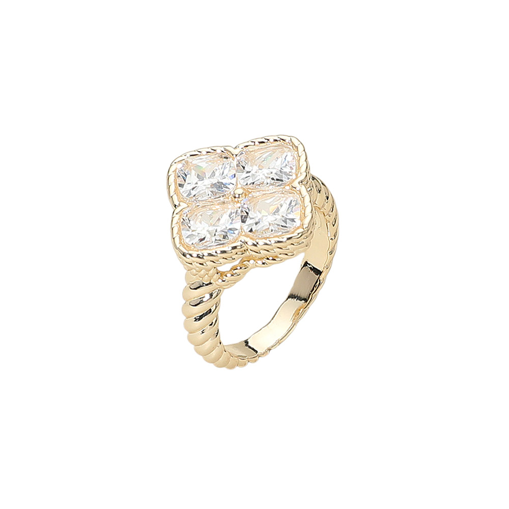 • Elegant ring showcasing a square cluster design with four faceted cz gemstones set in a raised border. The textured band adds a refined touch, making this geometric ring a standout accessory that balances color, form, and sophistication for any outfit or occasion.
