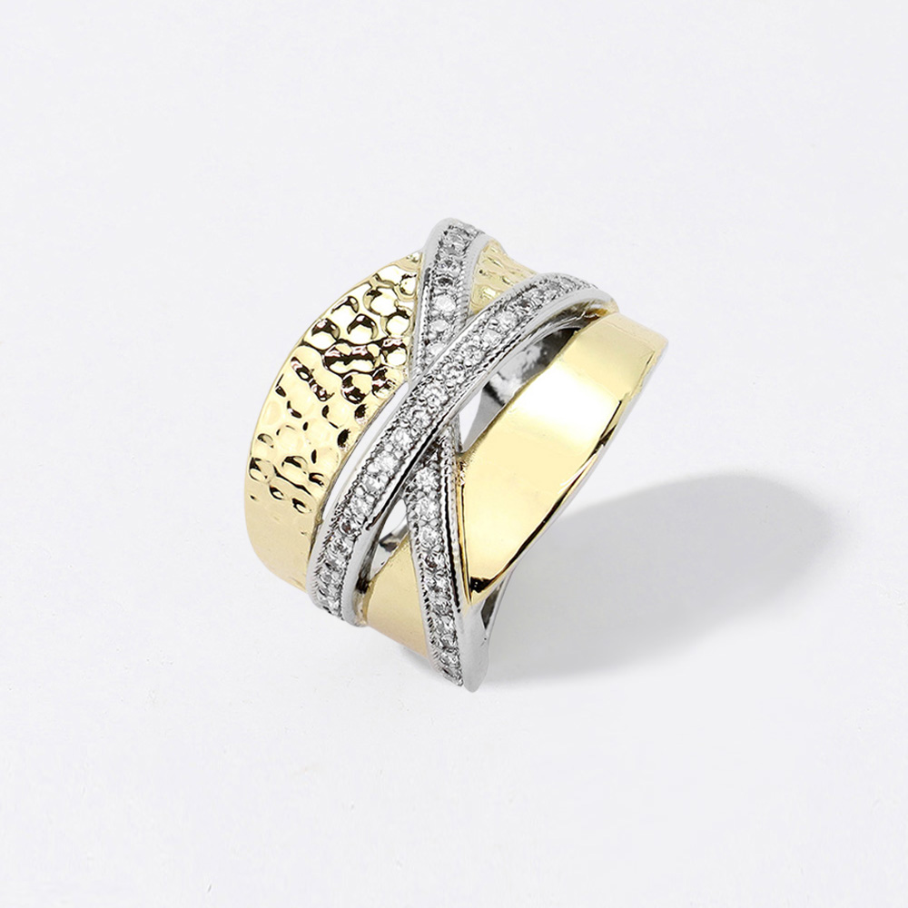• Make a bold statement with this wide crossover band ring featuring textured details, polished shine, and sparkling accents. A stylish two-tone design perfect for special occasions, everyday wear, or gifting to someone who loves modern elegant jewelry.