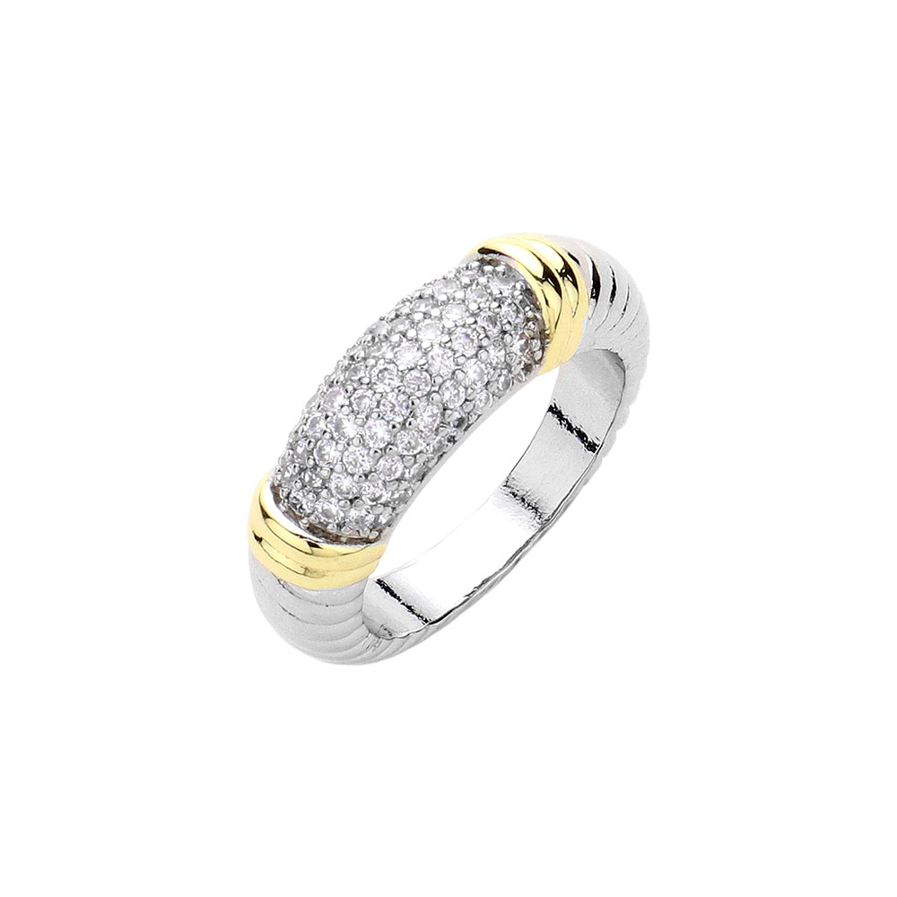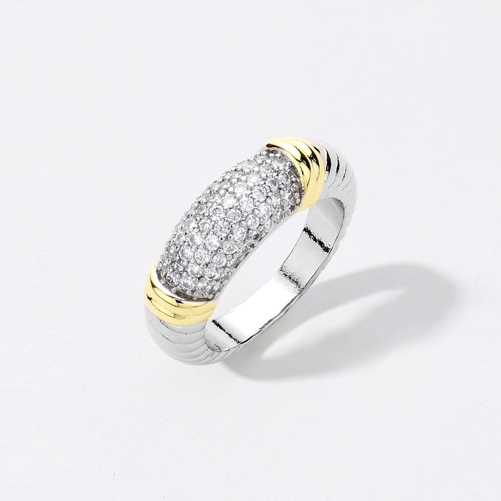 • Elegant band ring with pavĂ© CZ centerpiece and polished metal accents. Ideal for daily wear or special occasions with timeless charm.