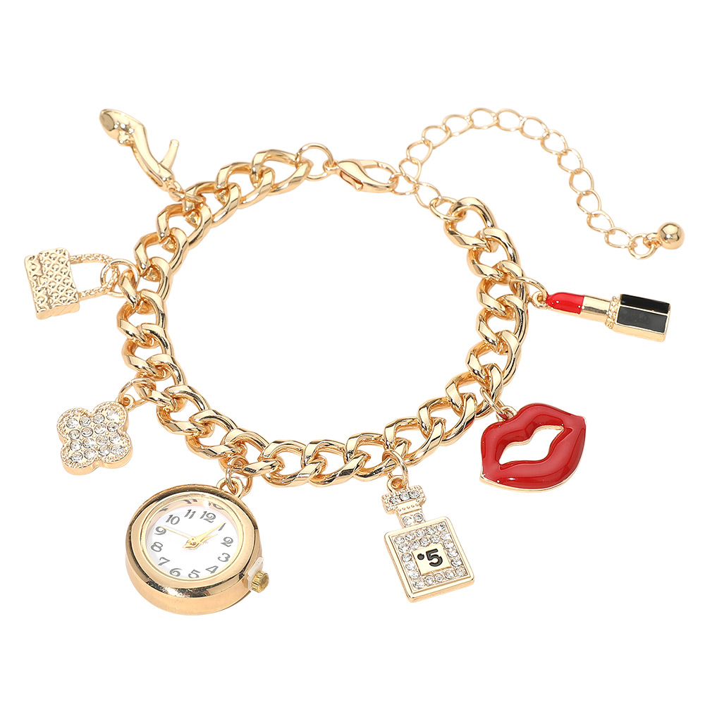 Silver Dipped Quatrefoil High Heel Lips Lipstick Charm Watch Bracelet
