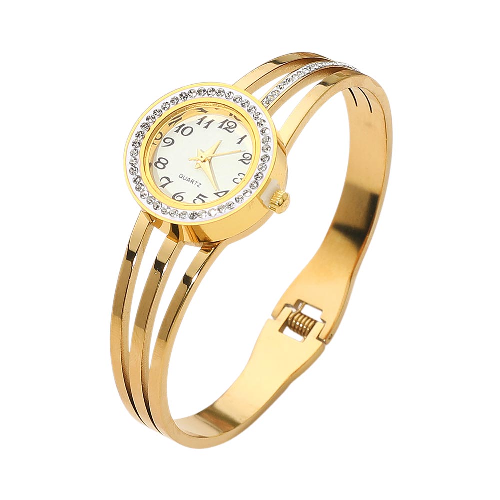 Details • Size : 0.9" H, 2.4" D • Hinged Closure • Water Resistant • Add timeless sophistication to your look with this elegant bangle-style quartz watch. Featuring a slim triple-band bracelet and a crystal-accented bezel, this chic timepiece perfectly balances fashion and function, making it an ideal accessory for any occasion. • Hypoallergenic • Stainless Steel