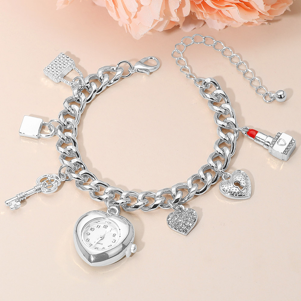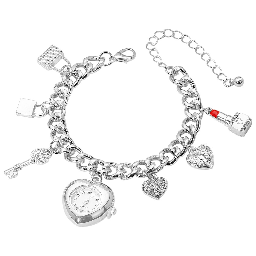 Details • Size : 0.4" H, 7.5" + 3' L • Charm Size : 1" L • Lobster Clasp Closure • Bring playful elegance to your wrist with this heart charm bracelet watch. Featuring a polished chain adorned with hearts, a key, and a lipstick charm, it combines chic detail with everyday functionality. A stylish timepiece that adds sparkle and personality to any look. • Sterling Silver Dipped • Lead and Nickel Compliant