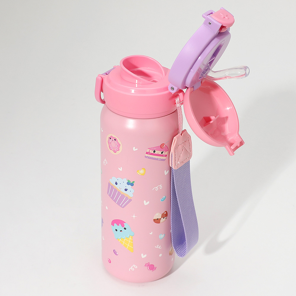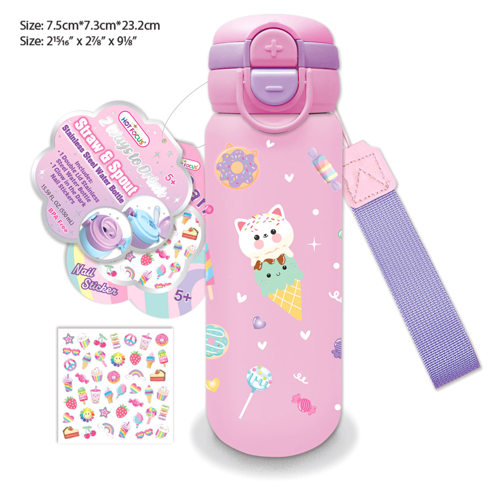 Details • Size : 2.5" X 9" (15.59fl.oz. / 550ml) • Sticker Size : 2.3" X 2.3" • Strap Size : 6.25" L • Pop Open • Easy Carry with Strap • BPA Free • Do not microwave • Not intended for hot liquids • Clean water bottle with dish soap and warm water before use • Hand wash only • 1 Double lid Stainless Steel Water Bottle, 1 Grow in the Dark Nail Sticker Included • Stainless Steel