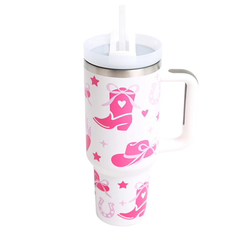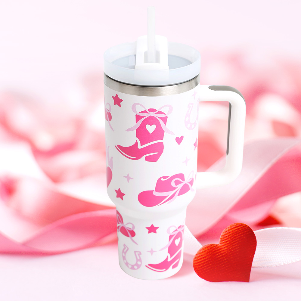 Western Boot Hear Horseshoe Pattern Printed 40oz Stainless Steel Tumbler with Handle