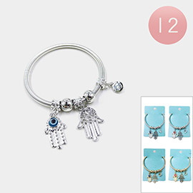 12PCS - Stone Paved Elephant Love Heart Hamsa Hand Charm Adjustable Bracelets