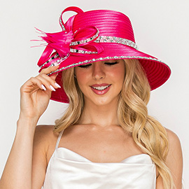 Rhinestone Center Feather Bow Accent Dressy Hat