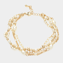 3PCS - Pearl Metal Bar Beaded Stretch Multi Layered Bracelets